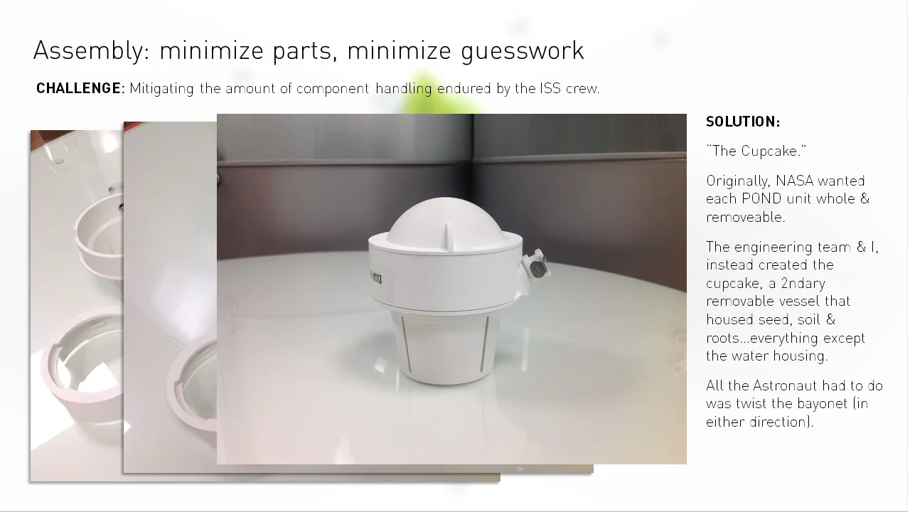 - Toured NASA’s development center, spoke with their model shop & development personal to get an comprehensive understanding of the VEGGIE system.